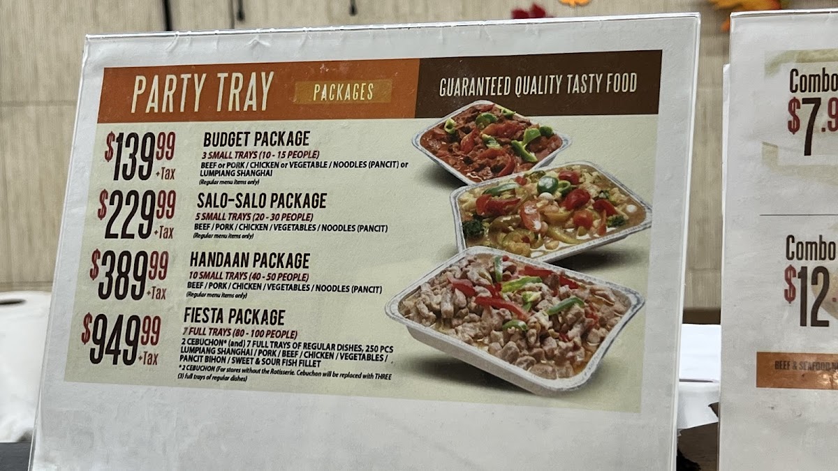 3 Small Trays: 1 HT Choice of Lumpinag Shanghai/Pansit Bihon, 1 HT Choice of Chicken or Vegetable Menu, 1 HT Choice of Prok or Beef Menu.